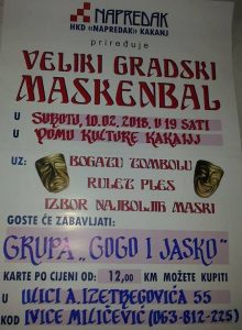 U subotu 10.2.2018.godine u 19:00 sati u Domu kulture u Kaknju bit će upriličen Tradicionalni veliki gradski maskenbal u organizaciji Hrvatskog kulturnog društva “Napredak”.