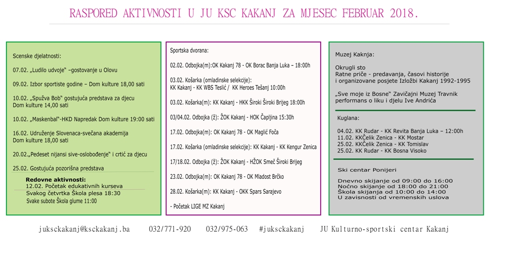 Raspored aktivnosti u JU KSC Kakanj za mjesec februar 2018. godine Raspored aktivnosti u JU KSC Kakanj za mjesec februar 2018. godine Klik na sliku za veći format 2018-02-01 Maja Hodzic Share !